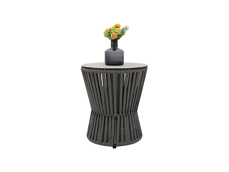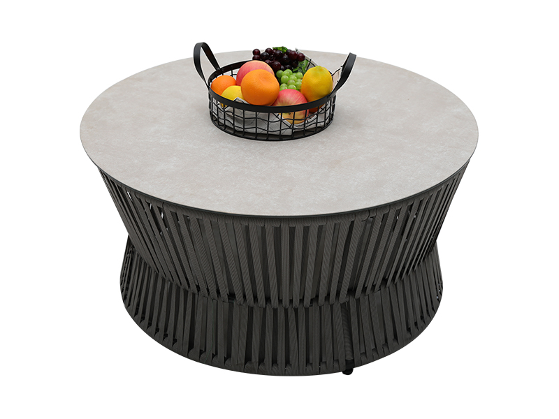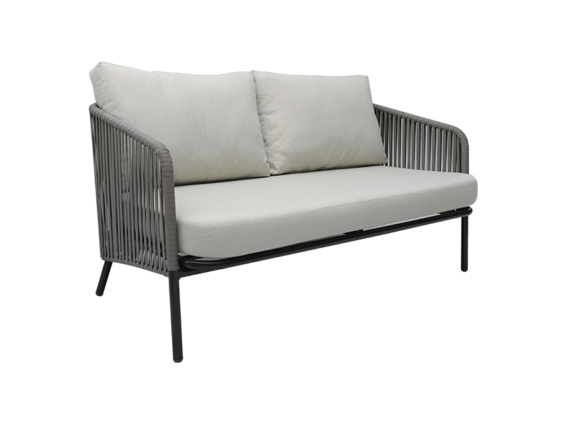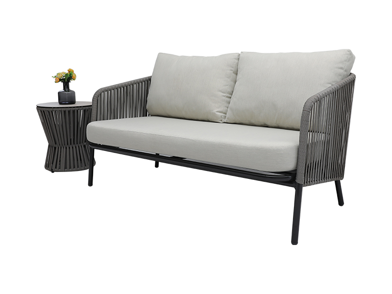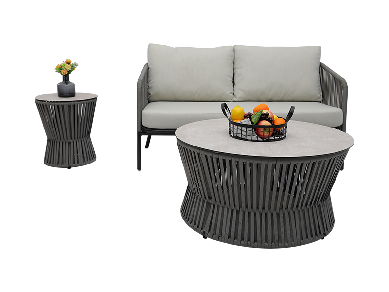 | Specyfikacja | aluminiowa rama opleciona płaską liną, poduszka siedziska 10 cm z gąbką wewnątrz, poduszka oparcia z wypełnieniem z włókna wewnątrz, tkanina poliestrowa 230g/m2; krzesło pojedyncze: dł. 82*szer.75*wys.69cm, 2 szt.; krzesło dwuosobowe: dł. 82*szer.142*wys.69cm, 1 szt.; stolik kawowy: ∮85*W43cm, szkło 6mm na bazie ceramiki; Stolik boczny: ∮42*W48cm, szkło 6mm na bazie ceramiki |